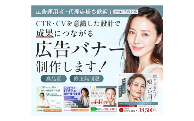 広告バナー・LP制作を中心に、構成・デザイン・実装まで一貫して対応し、見た目の美しさだけでなく、ターゲット・導線・成果を意識した設計を強みとしています。